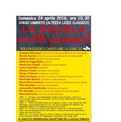 . Il Comitato referendario molfettese per la scuola pubblica invita la cittadinanza alla prima assemblea pubblica dal titolo “La scuola nelle piazze: per conoscere e cancellare la legge 107” che si terrà