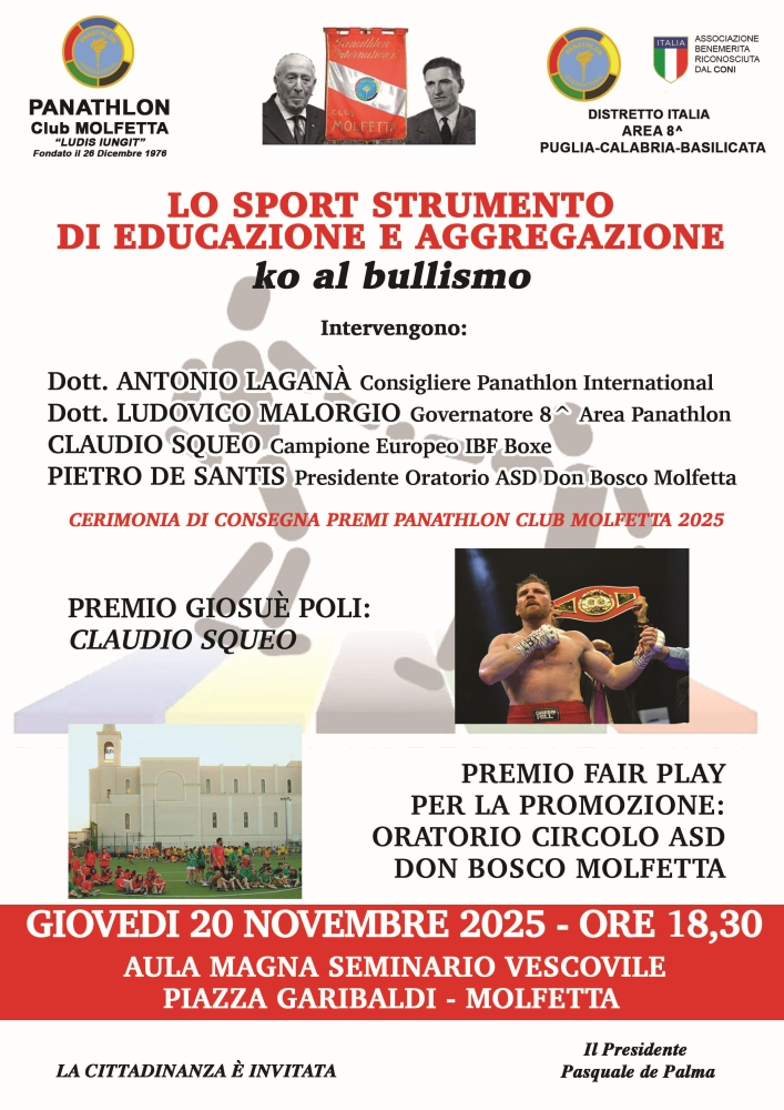 Saranno affiancati dal pugile Claudio Squeo Campione Europeo Boxe e dal Presidente dell’Oratorio Circolo ASD Don Bosco Molfetta Sig.Pietro De Santis, protagonisti al termine della conferenza anche della Cerimonia di consegna del Premio Giosuè Poli e del Premio Fair Play alla Promozione.