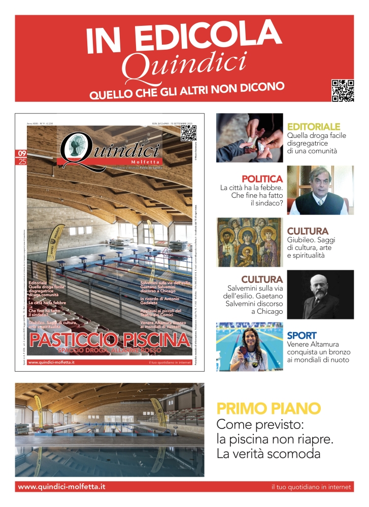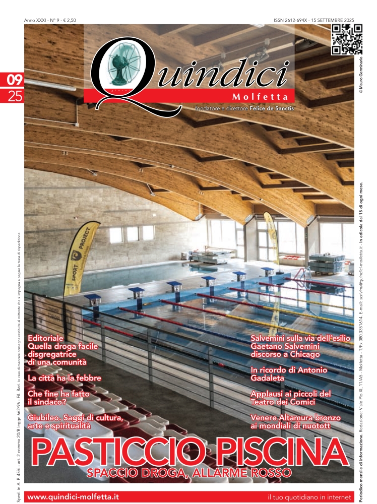 MOLFETTA – Pasticcio piscina, spaccio droga allarme rosso, la città ha la febbre, sono gli argomenti di primo piano della rivista mensile “Quindici” in edicola a Molfetta.