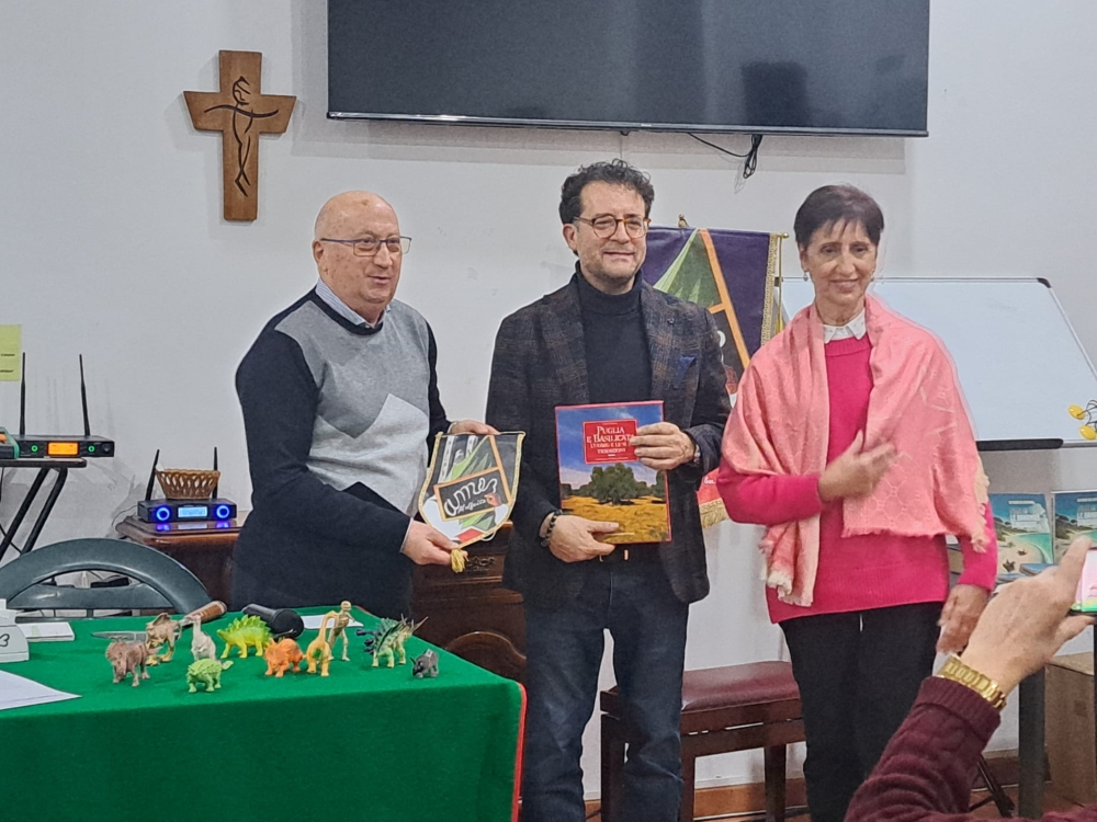 – Ancora un interessante appuntamento all’AMEB (Associazione educatori benemeriti) di Molfetta, con la conferenza-performance di Alfredo De Giovanni, geologo, musicista e divulgatore scientifico, dedicata alla storia antica della Puglia e alle tracce dei suoi dinosauri. L’evento ha attirato appassionati di geologia, paleontologia e cultura locale, trasformando la scoperta scientifica in un’esperienza immersiva e coinvolgente. La Puglia nasconde un passato sorprendente fatto di mari tropicali, barriere coralline e dinosauri. Durante il Cretaceo inferiore e superiore, tra circa 145 e 66 milioni di anni fa, il territorio faceva parte della Piattaforma Apula, una vasta piattaforma carbonatica sul margine della placca africana. Le acque erano calde e poco profonde, perfette per la deposizione di fanghi e sabbie carbonatiche, per la crescita di barriere coralline e rudisti e per la formazione di lagune e piane tidali, molto simili a quelle delle moderne Bahamas. Questi sedimenti, nel corso del tempo, si sono trasformati in rocce calcaree bianche, stratificate e compatte, visibili oggi lungo le scogliere, le cave e le colline della Murgia, del Gargano e delle Serre del Salento. Su queste piane tidali emerse camminavano dinosauri erbivori e carnivori, lasciando impronte che ancora oggi costituiscono preziose testimonianze paleontologiche. La Puglia è oggi la regione con la maggiore concentrazione di orme di dinosauro al mondo, con oltre 30 geositi censiti. Tra i più importanti c’è Pontrelli ad Altamura, dove sono state rinvenute circa 30.000 impronte su superfici di strato in situ. Anche nella nostra Molfetta, nel sito San Leonardo vicino al Pulo, nel 2005 vennero scoperte tracce significative che hanno contribuito a mappare la diffusione dei dinosauri nelle Murge nord-orientali. Questi siti documentano sia impronte su strati originali sia su blocchi calcarei distaccati, offrendo informazioni uniche su locomozione, paleoecologia e dinamiche sedimentarie delle piattaforme carbonatiche. Il libro Puglia. Le Bahamas dei dinosauri, pubblicato da ERF Edizioni e scritto da Alfredo De Giovanni, geologo, musicista e divulgatore scientifico, accompagna i lettori in questo viaggio nel tempo. L’opera è strutturata in due parti: una narrativa, di circa cento pagine, e una sezione scientifica molto più ampia, oltre duecento pagine. Il testo è ricco di tavole, schemi, fotografie, note, tabelle e QR code che rimandano ad altri materiali. Ogni capitolo è introdotto da massime di autori come Albert Einstein, Oriana Fallaci e Confucio che rendono la lettura stimolante e multidisciplinare. La sezione narrativa si svolge nell’Alta Murgia nel 2013: il protagonista, Nino, ha diciannove anni e lavora nella cava di pietra calcarea della sua famiglia a Ruvo di Puglia. Una frana improvvisa porta alla luce impronte di dinosauri risalenti al Cretaceo. Grazie a Johanna, una giovane italoamericana e figlia di un noto geologo, Robert Wake, Nino comprende il valore della scoperta, che trasformerà la sua vita. La parte scientifica approfondisce la stratigrafia delle piattaforme carbonatiche, la sedimentologia dei calcari cretacei, le barriere coralline e i rudisti, la paleontologia dei dinosauri e la distribuzione dei geositi regionali. In questo modo il libro assume un doppio ruolo, quello di romanzo e di testo divulgativo, utile sia agli esperti sia agli appassionati di geologia e paleontologia. La presentazione-performance multimediale ha trasformato la scienza in racconto immersivo. Attraverso proiezioni e mappe geologiche, il pubblico ha ammirato rocce, stratigrafia e impronte fossili come se fossero sul posto. Suoni e musiche hanno ricreato l’atmosfera dei mari cretacei, mentre la narrazione teatrale ha guidato lungo le fasi della formazione delle piattaforme carbonatiche e della deposizione dei sedimenti. La performance ha permesso inoltre di interagire con campioni di rocce e calchi di impronte, collegando direttamente il racconto alla realtà scientifica. In questo modo rigore scientifico e narrazione creativa si fondono, rendendo accessibile a studenti, curiosi e appassionati la storia antica della Puglia, trasformando la geologia e la paleontologia in un’esperienza sensoriale e coinvolgente. Al termine della conferenza, De Giovanni è stato omaggiato dal presidente prof. Michele Laudadio con il gagliardetto dell’AMEB e con una copia del libro Puglia e Basilicata, l’uomo e le sue tradizioni.