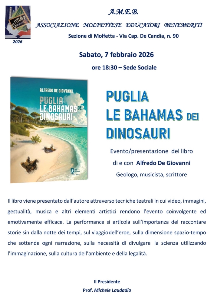 MOLFETTA - L’AMEB (Associazione educatori benemeriti) incontra Alfredo De Giovanni sabato 7 febbraio nella sede sociale in via Cap. De Candia n.90 alle ore 18,30 in occasione della settimana nazionale delle discipline scientifiche, tecnologiche, ingegneristiche e matematiche, istituita con legge 187/2023 e in programma dal 4 all’11 febbraio 2026.