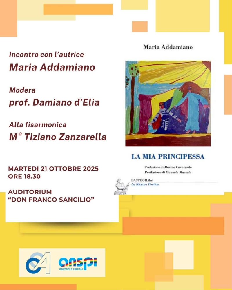 MOLFETTA – Questa sera alle ore 18.30 nell’Auditorium “Don Franco Sancilio” della Chiesa di San Domenico a Molfetta ci sarà la presentazione dell’ultimo libro di Maria Addamiano “La mia principessa” (Prefazione di Marina Caracciolo, postfazione di Manuela Mazzola).
