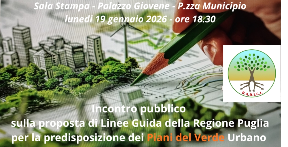 - L’ associazione R.A.D.I.C.I. , lunedì 19 gennaio dalle 18.30 alle ore 21 invita la cittadinanza, i tecnici e le associazioni ad un incontro pubblico presso la Sala Stampa di Palazzo Giovene a Molfetta, per conoscere la bozza di Regolamento regionale “Linee Guida della Regione Puglia sulla valorizzazione del verde urbano e periurbano, previste dall'Art. 4 della L.R. 23/2024” redatta dal sezione Urbanistica della Regione Puglia insieme al Tavolo Tecnico composto da Dott.for. Lucia Pesola, Dott.agr. Giovanni Battista Guerra, Arch. Annamaria Fabrizia Gagliardi. Tali elaborati sono pubblicati all’indirizzo