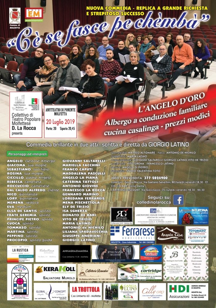 MOLFETTA - Ritorna il Collettivo teatro popolare molfettese Dino la Rocca con la replica della commedia brillante dal titolo chilometrico “ Cè se fasce pe chèmbà – Angelo d’oro – Albergo a conduzione familiare - cucina casalinga- prezzi modici –“che ha ottenuto grande successo di critica e di pubblico.