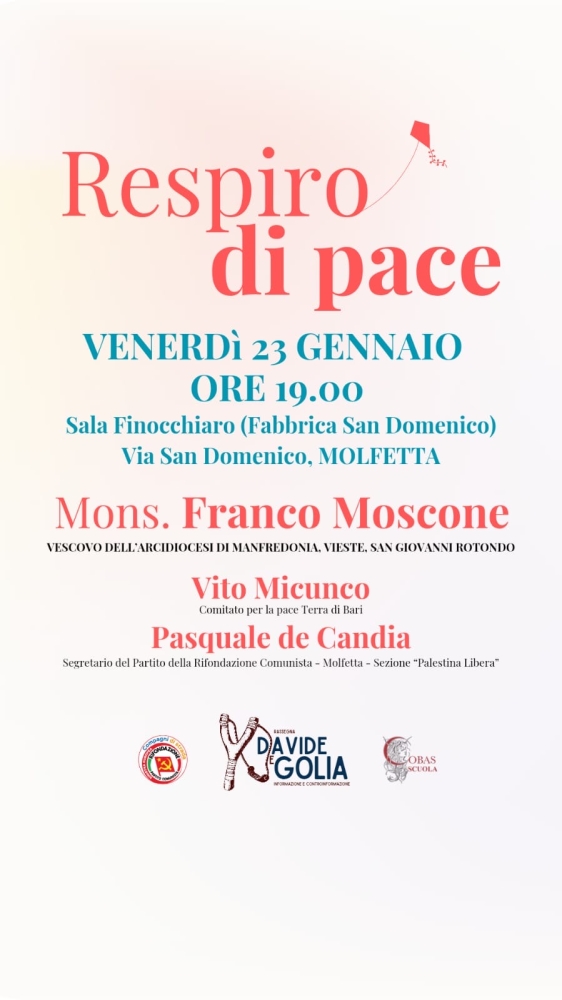 MOLFETTA - Venerdì 23 gennaio alle ore 19 si terrà presso la Sala Finocchiaro, l'incontro intitolato "Respiro di pace", organizzato dal circolo Rifondazione comunista di Molfetta. All'incontro prenderanno parte mons. Francesco Moscone arcivescovo di Manfredonia, Vito Micunco del Comitato per la pace terra di Bari e Pasquale de Candia segretario cittadino del Partito della Rifondazione Comunista.
