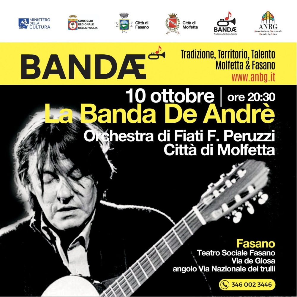 346 002 3446 Un appuntamento da non perdere per rivivere insieme il patrimonio musicale e poetico di Fabrizio De André attraverso la forza della banda.