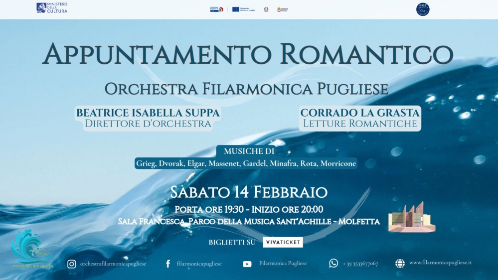 MOLFETTA - Un “Appuntamento romantico” dedicato alla musica del cuore: sabato 14 febbraio alle 20 (ingresso alle 19:30) l’Orchestra Filarmonica Pugliese sale sul palco della Sala Francesca, al Parco della Musica Sant’Achille di Molfetta, per celebrare San Valentino in un modo inconsueto e speciale.