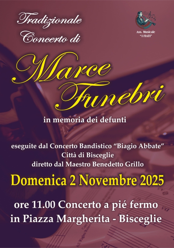L’appuntamento è per domenica 2 novembre, alle ore 11:00, in Piazza Margherita a Bisceglie, dove la Banda si esibirà in un concerto a piè fermo, proponendo alcune tra le più celebri marce funebri del repertorio bandistico pugliese.